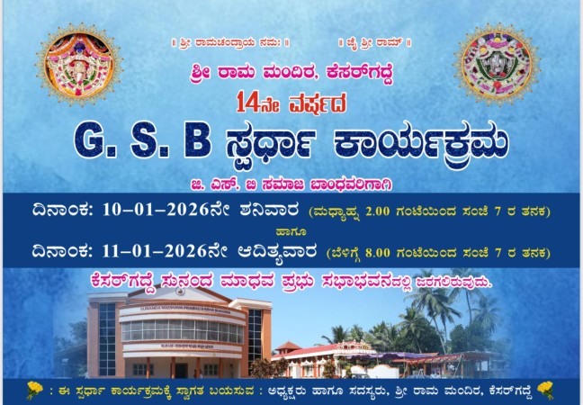 ಕೆಸರ್ ಗದ್ದೆಯ ಶ್ರೀ ರಾಮ ಮಂದಿರದಲ್ಲಿ ಪ್ರತಿವರ್ಷದಂತೆ ಈ ವರ್ಷವೂ 14ನೇ ವರ್ಷದ G.S.B ಸ್ಪರ್ಧಾ ಕಾರ್ಯಕ್ರಮವನ್ನು ಅತ್ಯಂತ ವೈಭವದಿಂದ ಆಯೋಜಿಸಲಾಗಿದೆ.