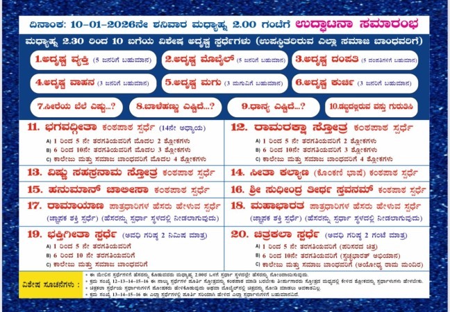 ಕಾರ್ಯಕ್ರಮವು ದಿನಾಂಕ 10-01-2026 (ಶನಿವಾರ) ಮಧ್ಯಾಹ್ನ 2.00 ಗಂಟೆಯಿಂದ ಸಂಜೆ 7.00 ಗಂಟೆಯವರೆಗೆ ಹಾಗೂ ದಿನಾಂಕ 11-01-2026 (ಭಾನುವಾರ) ಬೆಳಿಗ್ಗೆ 8.00 ಗಂಟೆಯಿಂದ ಸಂಜೆ 7.00 ಗಂಟೆಯವರೆಗೆ ನಡೆಯಲಿದೆ.