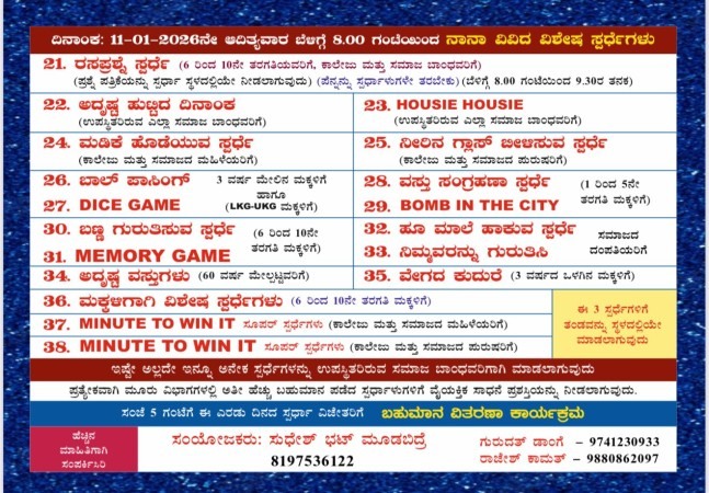 ಈ ಕುರಿತು ಅಗತ್ಯ ಮಾಹಿತಿಯನ್ನು ಆಯೋಜಕರ ಪರವಾಗಿ ಸುಧೇಶ್ ಭಟ್ ಮೂಡಬಿದ್ರೆ ಅವರು ನೀಡಿದ್ದಾರೆ.