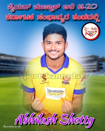 ಉಡುಪಿ ಜಿಲ್ಲೆಯ ಕೋಟಾದ ಮೂಡು ಗಿಳಿಯಾರಿನ ಪ್ರತಿಭಾವಂತ ಎಡಗೈ ವೇಗದ ಬೌಲರ್ ಅಭಿಲಾಷ್ ಶೆಟ್ಟಿ 26 ಮಂದಿ ಸದಸ್ಯರ ಕರ್ನಾಟಕ ಸಂಭಾವ್ಯರ ತಂಡದಲ್ಲಿ ಸ್ಥಾನ ಪಡೆದಿದ್ದಾರೆ. ಎಡಗೈ ಸ್ವಿಂಗ್ ಬೌಲಿಂಗ್’ನಿಂದ ಗಮನ ಸೆಳೆಯುತ್ತಿರುವ ಅಭಿಲಾಷ್ ಶೆಟ್ಟಿ ಸದ್ಯ ಕರ್ನಾಟಕ ರಣಜಿ ತಂಡದಲ್ಲಿದ್ದಾರೆ. ಭಾರತ ಕ್ರಿಕೆಟ್ ತಂಡದ ಸ್ಟಾರ್ ಬ್ಯಾಟ್ಸ್’ಮನ್ ಕೆ.ಎಲ್ ರಾಹುಲ್ ಕೂಡ ಸೈಯದ್ ಮುಷ್ತಾಕ್ ಅಲಿ ಟೂರ್ನಿಗೆ ಕರ್ನಾಟಕದ ಸಂಭಾವ್ಯರ ತಂಡದಲ್ಲಿ ಕಾಣಿಸಿಕೊಂಡಿದ್ದಾರೆ.