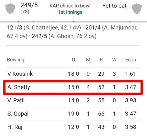 ಮನೆಯಂಗಳದಲ್ಲೇ ರಣಜಿ ಪಾದಾರ್ಪಣೆಯ ಅದ್ಭುತ ಅವಕಾಶ ಪಡೆದ ಅಭಿಲಾಷ್ ಶೆಟ್ಟಿ, ಮೊದಲ ಪಂದ್ಯದಲ್ಲಿ 15 ಓವರ್ ಬೌಲಿಂಗ್ ಮಾಡಿ, 52 ರನ್ನಿತ್ತು 1 ವಿಕೆಟ್ ಪಡೆದರು. ಬಂಗಾಳದ ಅಲ್ವಿನ್ ಘೋಷ್ ಪ್ರಥಮದರ್ಜೆ ಕ್ರಿಕೆಟ್’ನಲ್ಲಿ ಕರಾವಳಿ ಹುಡುಗನ ಮೊದಲ ಬಲಿಯಾದರು.