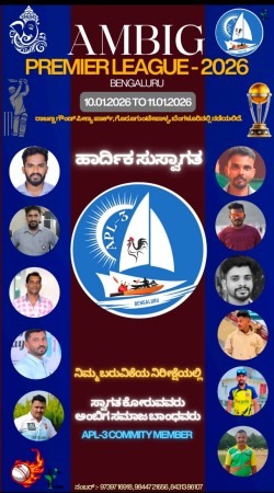 ಅಂಬಿಗ ಸಮಾಜದ ಕ್ರಿಕೆಟ್ ಅಭಿಮಾನಿಗಳ ನಿರೀಕ್ಷೆಗೆ ತಕ್ಕಂತೆ ಅಂಬಿಗ್ ಪ್ರೀಮಿಯರ್ ಲೀಗ್–2026 ಕ್ರಿಕೆಟ್ ಟೂರ್ನಿ ಅದ್ಧೂರಿಯಾಗಿ ಆಯೋಜಿಸಲಾಗುತ್ತಿದೆ. ಈ ಟೂರ್ನಿಯಲ್ಲಿ APL–3 (ಪುರುಷರ ವಿಭಾಗ) ಮತ್ತು WAPL–1 (ಮಹಿಳಾ ವಿಭಾಗ) ಪಂದ್ಯಗಳು ನಡೆಯಲಿದ್ದು, ಯುವ ಹಾಗೂ ಅನುಭವಿ ಆಟಗಾರರಿಗೆ ತಮ್ಮ ಪ್ರತಿಭೆ ಪ್ರದರ್ಶಿಸಲು ಮಹತ್ವದ ವೇದಿಕೆ ಒದಗಲಿದೆ.