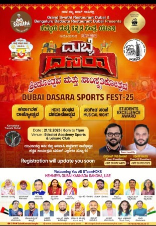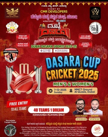 ದುಬೈ ದಸರಾ ಕಪ್ ಕ್ರಿಕೆಟ್ ಡಿಸೆಂಬರ್ 7ಕ್ಕೆ- ಹೆಮ್ಮೆಯ ದುಬೈ ಕನ್ನಡ ಸಂಘದಿಂದ 7ನೇ ವರ್ಷದ ದಸರಾ ಕಪ್ ಕ್ರಿಕೆಟ್ ಆಯೋಜನೆ