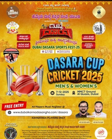 ವಿಶ್ವ ವಿಖ್ಯಾತ ನಾಡ ಹಬ್ಬ ಮೈಸೂರು ದಸರಾ ಪ್ರಯುಕ್ತ ಹೆಮ್ಮೆಯ ದುಬೈ ಕನ್ನಡ ಸಂಘದ ವತಿಯಿಂದ ನಡೆಯಲಿರುವ ಏಳನೇ ವರ್ಷದ ಯುಎಇ ಕನ್ನಡಿಗರ ದುಬೈ ದಸರಾ ಕ್ರೀಡೋತ್ಸವ ಮತ್ತು ಸಾಂಸ್ಕೃತಿಕೋತ್ಸವದ ಭಾಗವಾದ ದುಬೈ ದಸರಾ ಕಪ್ ಕ್ರಿಕೆಟ್ ಪಂದ್ಯಾವಳಿಗಳು ನವೆಂಬರ್ 7ಕ್ಕೆ ಅಲ್ ಕ್ವಾಸಿಸ್ ಮೈದಾನದಲ್ಲಿ ಬೆಳಿಗ್ಗೆ 9ರಿಂದ ಸಂಜೆ 6ರ ತನಕ ಮೂರು ಐದು ಮೈದಾನಗಳಲ್ಲಿ ಒಂದೇ ಸಮಯದಲ್ಲಿ ನಡೆಯಲಿದೆ, ಈ ಕ್ರಿಕೆಟ್ ಪಂದ್ಯಾವಳಿಗಳು ಸಂಯುಕ್ತ ಅರಬ್ ಸಂಸ್ಥಾನದಲ್ಲಿ ನೆಲಸಿರುವ ಸಮಸ್ತ ಅನಿವಾಸಿ ಪುರುಷ ಮತ್ತು ಮಹಿಳಾ ಕನ್ನಡಿಗರಿಗೆ ಆಯೋಜಿಸಿದ್ದಾರೆ,