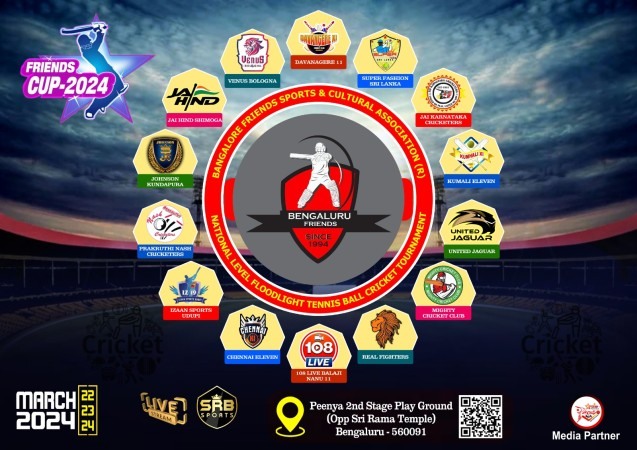 ಬೆಂಗಳೂರು ಫ್ರೆಂಡ್ಸ್ ಸ್ಪೋರ್ಟ್ಸ್ & ಕಲ್ಚರಲ್ ಅಸೋಸಿಯೇಷನ್ ಇವರ ಆಶ್ರಯದಲ್ಲಿ ನಡೆಯಲಿರುವ ಅಂತರಾಷ್ಟ್ರೀಯ ಮಟ್ಟದ ಕ್ರಿಕೆಟ್ ಪಂದ್ಯಾಟದಲ್ಲಿ ಭಾಗವಹಿಸುವ ತಂಡಗಳ ಮಾಲೀಕರ ಭೇಟಿ, ಜೆರ್ಸಿ ಅನಾವರಣ ಮತ್ತು ಪಂದ್ಯಾಟ ವೇಳಾಪಟ್ಟಿ ಬಿಡುಗಡೆ ಸಮಾರಂಭ ಬೆಂಗಳೂರಿನ ಸುಂಕದಕಟ್ಟೆಯ ಜೈ ಮಾರುತಿ ಕನ್ವೆನ್ಷನ್ ಹಾಲ್ ನಲ್ಲಿ ಮಾರ್ಚ್ 14 ರಂದು ಸಂಜೆ 6:00 ಗಂಟೆಗೆ ನಡೆಯಿತು.