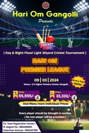 ಹರಿ ಓಂ ಗಂಗೊಳ್ಳಿ ಮಾರ್ಚ್ 9 ರಂದು ಗಂಗೊಳ್ಳಿಯ ಎಸ್ ವಿ ಹೈಯರ್ ಪ್ರೈಮರಿ ಸ್ಕೂಲ್ ಮೈದಾನದಲ್ಲಿ ಎರಡು ದಿನಗಳ ತೀವ್ರ ಪೈಪೋಟಿಯೊಂದಿಗೆ ಜಿ ಎಸ್ ಬಿ ಸಮುದಾಯವನ್ನು ಆಕರ್ಷಿಸುವ ಕ್ರಿಕೆಟ್ ಪಂದ್ಯಾವಳಿಯ ಬಹು ನಿರೀಕ್ಷಿತ ಹರಿ ಓಂ ಗಂಗೊಳ್ಳಿ ಜಿ ಎಸ್ ಬಿ ಪ್ರೀಮಿಯರ್ ಲೀಗ್ 2024 ಅನ್ನು ಘೋಷಿಸಲು ರೋಮಾಂಚನಗೊಂಡಿದೆ. ಇದು ಹೊನಲು ಬೆಳಕಿನ 30 ಗಜಗಳ ಫ್ರ್ಯಾಂಚೈಸ್ ಆಧಾರಿತ ಕ್ರಿಕೆಟ್ ಪಂದ್ಯಾಟ ವಾಗಿದ್ದು ಈ ಕ್ರಿಕೆಟ್ ಪಂದ್ಯಾಕೂಟದಲ್ಲಿ ಹಲವಾರು ಜಿ ಎಸ್ ಬಿ ಕ್ರಿಕೆಟಿಗರು ಪಂದ್ಯಾವಳಿಗೆ ನೋಂದಾಯಿಸಿಕೊಂಡಿದ್ದಾರೆ. ಹರಾಜಿನ ಮೂಲಕ ಆಟಗಾರರನ್ನು ವಿವಿಧ ತಂಡಗಳಿಗೆ ನೀಡಲಾಗುವುದು.