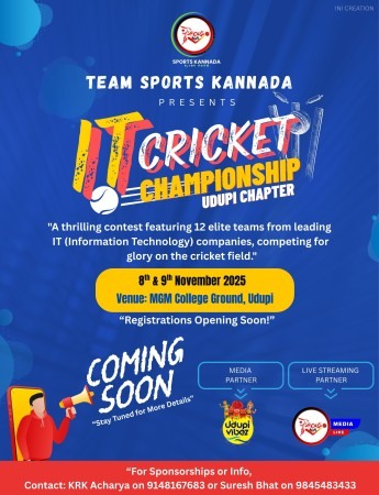 ಉಡುಪಿಯಲ್ಲಿ ದೊಡ್ಡ ಮಟ್ಟದ ಐಟಿ ಕ್ರಿಕೆಟ್ ಹಬ್ಬ ನೆರವೇರಲಿದೆ. ಸ್ಪೋರ್ಟ್ಸ್ ಕನ್ನಡ ಸುದ್ದಿವಾಹಿನಿಯ ಪ್ರಾಯೋಜಕತ್ವದಲ್ಲಿ ನೆರವೇರಲಿರುವ ಈ ಪಂದ್ಯಾವಳಿಯು ಒಟ್ಟು 12 ತಂಡಗಳ ಕೂಡುವಿಕೆಯಲ್ಲಿ ಮಹಾತ್ಮ ಗಾಂಧಿ ಬಯಲು ರಂಗ ಮಂದಿರ ಮೈದಾನ ಉಡುಪಿಯಲ್ಲಿ ಇದೇ ಬರುವ ನವೆಂಬರ್ 8 ಹಾಗೂ 9 ರಂದು ನೆರವೇರಲಿದೆ.