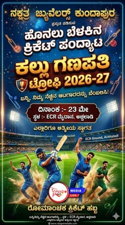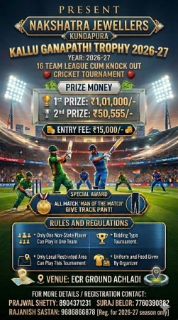ಕುಂದಾಪುರದ ಪ್ರತಿಷ್ಠಿತ **ನಕ್ಷತ್ರ ಜ್ಯುವೆಲ್ಲರ್ಸ್** ಪ್ರಸ್ತುತಪಡಿಸುವ **ಕಲ್ಲು ಗಣಪತಿ ಟ್ರೋಫಿ 2026-27** ಕ್ರಿಕೆಟ್ ಟೂರ್ನಮೆಂಟ್ಗೆ ಭರ್ಜರಿ ಸಿದ್ಧತೆಗಳು ಪೂರ್ಣಗೊಂಡಿವೆ. ಈ ಟೂರ್ನಮೆಂಟ್ **16 ತಂಡಗಳ ಲೀಗ್ ಕಮ್ ನಾಕ್ಔಟ್ ಮಾದರಿಯಲ್ಲಿ** ನಡೆಯಲಿದ್ದು, ಕ್ರಿಕೆಟ್ ಅಭಿಮಾನಿಗಳಲ್ಲಿ ಈಗಾಗಲೇ ಅಪಾರ ಕುತೂಹಲ ಮೂಡಿಸಿದೆ.