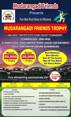 ಕಾಪು-ಇಲ್ಲಿನ ಮುದರಂಗಡಿ ಫ್ರೆಂಡ್ಸ್ ಆಶ್ರಯದಲ್ಲಿ ಮುದರಂಗಡಿ ಟೆನಿಸ್ಬಾಲ್ ಕ್ರಿಕೆಟ್ ಇತಿಹಾಸದಲ್ಲೇ ಪ್ರಪ್ರಥಮ ಬಾರಿಗೆ ರಾಜ್ಯ ಮಟ್ಟದ “ಮುದರಂಗಡಿ ಫ್ರೆಂಡ್ಸ್ ಟ್ರೋಫಿ-2024” ಕ್ರಿಕೆಟ್ ಪಂದ್ಯಾಟ ಆಯೋಜಿಸಲಾಗಿದೆ.