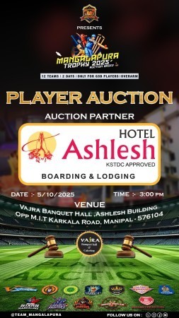 ಮಣಿಪಾಲ: ಕರಾವಳಿಯ ಜಿಎಸ್‌ಬಿ ಕ್ರಿಕೆಟ್ ಅಭಿಮಾನಿಗಳಿಗೆ ಮತ್ತೊಂದು ಸಡಗರದ ಕ್ಷಣ ಎದುರಾಗಿದೆ. ಬಹು ನಿರೀಕ್ಷಿತ ಮಂಗಳಾಪುರ ಟ್ರೋಫಿ 2025 ಈ ಬಾರಿ ಆಟಗಾರರ ಹರಾಜು ವಿಧಾನದಲ್ಲಿ ನಡೆಯಲಿದ್ದು, ಅದರ ಪ್ಲೇಯರ್ ಆಕ್ಷನ್ ಕಾರ್ಯಕ್ರಮವನ್ನು ಅಕ್ಟೋಬರ್ 5, 2025 ರಂದು ಸಂಜೆ 3 ಗಂಟೆಗೆ ಆಯೋಜಿಸಲಾಗಿದೆ.