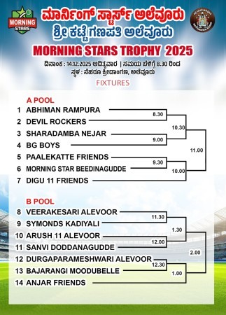 ಕಳೆದ ವಾರ ಅಲೆವೂರು ನೆಹರು ಮೈದಾನದಲ್ಲಿ ನಡೆದ ಮಾರ್ನಿಂಗ್ ಸ್ಟಾರ್ ಟ್ರೋಫಿ ಕ್ರಿಕೆಟ್ ಟೂರ್ನಮೆಂಟ್ ಯಶಸ್ವಿಯಾಗಿ ಮುಕ್ತಾಯವಾಯಿತು. ಅಂತಿಮ ಪಂದ್ಯದಲ್ಲಿ ಸೈಮಂಡ್ಸ್ ಕಡಿಯಾಳಿ ತಂಡ ಅದ್ಭುತ ಪ್ರದರ್ಶನ ನೀಡುವ ಮೂಲಕ ಚಾಂಪಿಯನ್ ಪಟ್ಟವನ್ನು ಅಲಂಕರಿಸಿತು. ಕಟ್ಟೆ ಗಣಪತಿ ಅಲೂರು ತಂಡ ರನ್ನರ್ಸ್ಅಪ್ ಸ್ಥಾನ ಪಡೆದುಕೊಂಡಿತು.