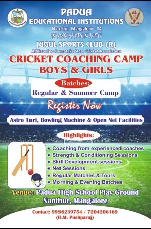 ಮಂಗಳೂರು: : ಪದುವ ಎಜುಕೇಷನಲ್ ಇನ್ಸ್ಟಿಟ್ಯೂಷನ್ಸ್ ವತಿಯಿಂದ ಕರ್ನಾಟಕ ಕ್ರಿಕೆಟ್ ಅಸೋಸಿಯೇಷನ್ ಗೆ ಸಂಯೋಜಿತವಾದ ಜುಗಲ್ ಸ್ಪೋರ್ಟ್ಸ್ ಕ್ಲಬ್ (ರಿ) ಸಹಯೋಗದಲ್ಲಿ ನಗರದಲ್ಲಿ ಬಾಲಕ ಮತ್ತು ಬಾಲಕಿಯರಿಗೆ ಕ್ರಿಕೆಟ್ ಕೋಚಿಂಗ್ ಕ್ಯಾಂಪ್ ಏರ್ಪಡಿಸಲಾಗಿದೆ.