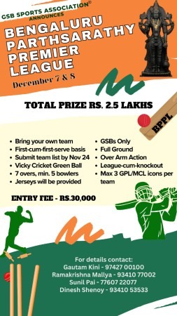 ಜಿ ಎಸ್ ಬಿ ಸ್ಪೋರ್ಟ್ಸ್ ಅಸೋಸಿಯೇಷನ್ ಆಯೋಜಿಸಿರುವ ಬೆಂಗಳೂರು ‘ಪಾರ್ಥಸಾರಥಿ ಪ್ರೀಮಿಯರ್ ಲೀಗ್’ಜಿ ಎಸ್ ಬಿ ಕ್ರಿಕೆಟ್ ಟೂರ್ನಮೆಂಟ್ 2024, ಡಿಸೆಂಬರ್ 7 ಮತ್ತು 8 ರಂದು ಬೆಂಗಳೂರಿನ ಸ್ಥಳೀಯ ವೆಟರ್ನರಿ ಕಾಲೇಜು ಮೈದಾನ ಹೆಬ್ಬಾಳದಲ್ಲಿ ನಡೆಯಲಿದೆ.
