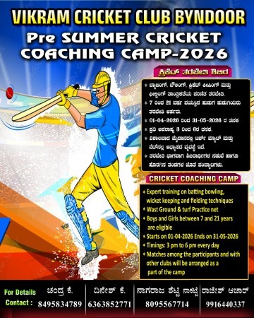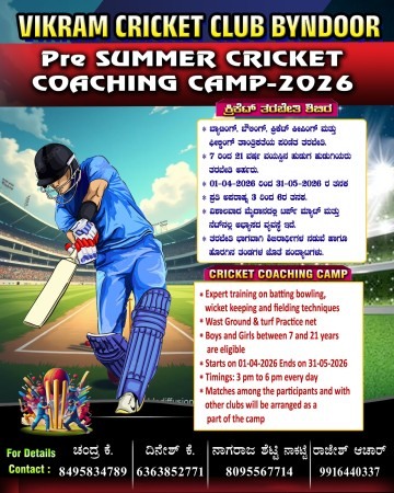 ಬೈಂದೂರು: ವಿಕ್ರಮ್ ಕ್ರಿಕೆಟ್ ಕ್ಲಬ್, ಬೈಂದೂರು ವತಿಯಿಂದ ಯುವಕರಲ್ಲಿ ಕ್ರಿಕೆಟ್ ಕೌಶಲ್ಯಗಳನ್ನು ಅಭಿವೃದ್ಧಿಪಡಿಸುವ ಉದ್ದೇಶದಿಂದ **“ಪ್ರೀ ಸಮ್ಮರ್ ಕ್ರಿಕೆಟ್ ಕೋಚಿಂಗ್ ಕ್ಯಾಂಪ್ – 2026”** ಆಯೋಜಿಸಲಾಗಿದೆ.
