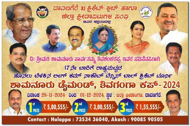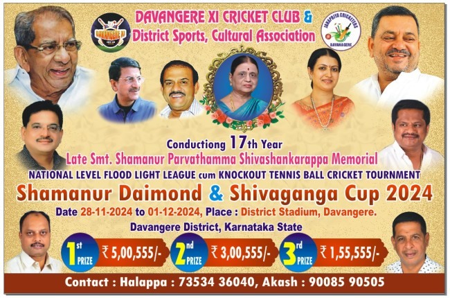 ದಾವಣಗೆರೆ ದಕ್ಷಿಣ ಶಾಸಕರಾದ ಡಾ.ಶಾಮನೂರು ಶಿವಶಂಕರಪ್ಪ ಇವರ ಧರ್ಮಪತ್ನಿ ದಿ.ಶ್ರೀಮತಿ ಶಾಮನೂರು ಪಾರ್ವತಮ್ಮ ಶಿವಶಂಕರಪ್ಪ ಇವರ ಸವಿನೆನಪಿಗಾಗಿ,ದಾವಣಗೆರೆ ಇಲೆವೆನ್ ಕ್ರಿಕೆಟ್ ಕ್ಲಬ್ ಹಾಗೂ ಜಿಲ್ಲಾ ಕ್ರೀಡಾಪಟುಗಳ ಸಂಘ ಆಶ್ರಯದಲ್ಲಿ 17 ನೇ ಬಾರಿ ಹೊನಲು ಬೆಳಕಿನ ರಾಷ್ಟ್ರೀಯ ಮಟ್ಟದ ಶಾಮನೂರು ಡೈಮಂಡ್ ಶಿವಗಂಗಾ ಟ್ರೋಫಿ-2024 ಆಯೋಜಿಸಲಾಗಿದೆ.