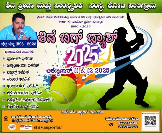 *ಕೋಟ ಸಾಲಿಗ್ರಾಮ, ಮೇ 30, 2025* – ಕೋಟದ ಪ್ರಸಿದ್ಧ ಶಿವ ಕ್ರೀಡಾ ಮತ್ತು ಸಾಂಸ್ಕೃತಿಕ ಸಂಸ್ಥೆಯ ಆಶ್ರಯದಲ್ಲಿ ಈ ವರ್ಷವೂ ಅದ್ದೂರಿಯಾಗಿ “ಶಿವ ಬಿಗ್ ಬ್ಯಾಶ್ 2025” ಕ್ರಿಕೆಟ್ ಟೂರ್ನಮೆಂಟ್ ಅನ್ನು ಅಕ್ಟೋಬರ್ 11 ಮತ್ತು 12 ರಂದು ಆಯೋಜಿಸಲಾಗಿದೆ.