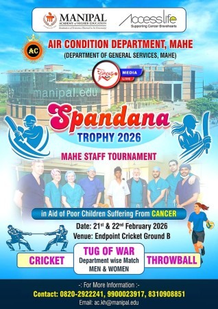 ಮಣಿಪಾಲ್ ಅಕಾಡೆಮಿ ಆಫ್ ಹೈಯರ್ ಎಜುಕೇಷನ್ (MAHE) ಇದರ ಏರ್ ಕಂಡೀಷನ್ ಡಿಪಾರ್ಟ್ಮೆಂಟ್ (ಸಾಮಾನ್ಯ ಸೇವೆಗಳ ವಿಭಾಗ) ವತಿಯಿಂದ ಆಯೋಜಿಸಲಾಗುತ್ತಿರುವ “ಸ್ಪಂದನ ಟ್ರೋಫಿ – 2026” ಕ್ರೀಡಾಕೂಟವು ಮಣಿಪಾಲದಲ್ಲಿ ವಿಶಿಷ್ಟ ಸಾಮಾಜಿಕ ಸಂದೇಶದೊಂದಿಗೆ ನಡೆಯಲಿದ್ದು, ಕ್ರೀಡಾಭಿಮಾನಿಗಳ ಗಮನ ಸೆಳೆಯುತ್ತಿದೆ.