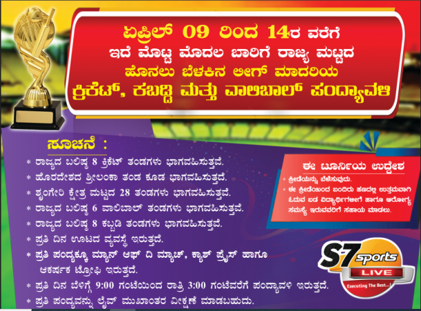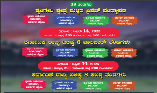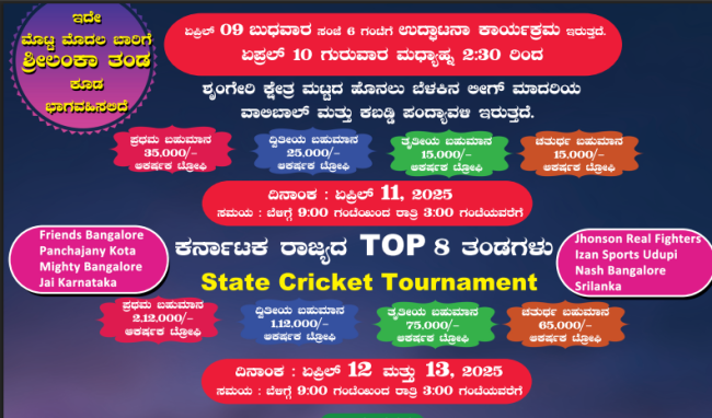 ಏಪ್ರಿಲ್ 12 ಮತ್ತು 13 – ಶೃಂಗೇರಿ ಮಟ್ಟದ 28 ಕ್ರಿಕೆಟ್ ತಂಡಗಳ ನಡುವೆ ಸ್ಪರ್ಧಾತ್ಮಕ ಪಂದ್ಯಾವಳಿಗಳು ನಡೆಯಲಿದ್ದು, ಈ ತಂಡಗಳಿಗೂ ನಗದು ಬಹುಮಾನದೊಂದಿಗೆ ಆಕರ್ಷಕ ಟ್ರೋಫಿಗಳು ಲಭಿಸಲಿವೆ.