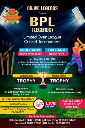ಬಜ್ಪೆಯಲ್ಲಿ ನಡೆಯುವ ಬಿಪಿಎಲ್ ಚಾಂಪಿಯನ್ಸ್ ಟೆನಿಸ್ ಬಾಲ್ ಕ್ರಿಕೆಟ್ ಪಂದ್ಯಾವಳಿಯು ಹೊನಲು ಬೆಳಕಿನ ಪಂದ್ಯಾಕೂಟವಾಗಿದ್ದು ನವೆಂಬರ್ 17, 18 ಮತ್ತು 19 ರಂದು ನಡೆಯಲಿದ್ದು, 40 ವರ್ಷ ಮೇಲ್ಪಟ್ಟ ಹಿರಿಯರಿಗೆ ಅಂಡರ್ ಆರ್ಮ್ ಮಾದರಿ ಹಾಗೂ 15 ವರ್ಷಕ್ಕಿಂತ ಕಿರಿಯರಿಗೆ ಓವರ್ ಆರ್ಮ್ ಪಂದ್ಯಾ ಕೂಟ ಹೊನಲು ಬೆಳಕಿನಲ್ಲಿ ನಡೆಯಲಿದೆ. ವಿಜೇತರಿಗೆ ಆಕರ್ಷಕ ನಗದು ಬಹುಮಾನಗಳ ಜೊತೆ ಟ್ರೋಫಿಗಳನ್ನು ನೀಡಿ ಗೌರವಿಸಲಾಗುವುದು.
