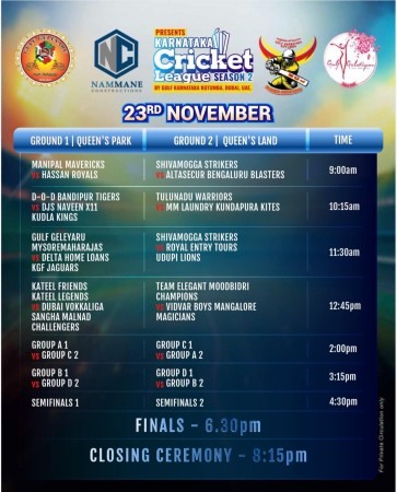 ಸಂಯುಕ್ತ ಅರಬ್ ರಾಷ್ಟ್ರದಲ್ಲಿ ಜರಗುವ ಈ ಪ್ರತಿಷ್ಠಿತ ಕ್ರಿಕೆಟ್ ಪಂದ್ಯಾವಳಿಯು ನವೆಂಬರ್ 22 ಶನಿವಾರ ಅಪರಾಹ್ನ ಶುಭಾರಂಭ ಗೊಳ್ಳಲಿದೆ.ತದನಂತರ ಪಂದ್ಯವು ಶನಿವಾರ ನಡುರಾತ್ರಿಯವರೆಗೆ ಸಾಗಲಿದೆ.ಮರುದಿನ ಮುಂಜಾನೆ ಒಂಬತ್ತರಿಂದ ರಾತ್ರಿ ಒಂಬತ್ತರವರೆಗೆ ನಿರಂತರವಾಗಿ ಮುಂದುವರಿಯುತ್ತದೆ. ಪಂದ್ಯಾವಳಿಯು ಮುಕ್ತಾಯವಾಗುತ್ತಿದ್ದಂತೆ ಪ್ರಶಸ್ತಿ ಪ್ರದಾನ ಸಮಾರಂಭ ಆ ಕೂಡಲೇ ನೆರವೇರುತ್ತದೆ.