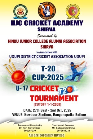 ಶಿರ್ವಾ: ಎಚ್‌ಜೆಸಿ ಕ್ರಿಕೆಟ್ ಅಕಾಡೆಮಿಯು ಹಿಂದು ಜೂನಿಯರ್ ಕಾಲೇಜ್ ಆಲೂಮ್ನಿ ಸಂಘ, ಶಿರ್ವಾ ಹಾಗೂ ಉಡುಪಿ ಜಿಲ್ಲೆ ಕ್ರಿಕೆಟ್ ಅಸೋಸಿಯೇಷನ್ (UDCA) ಸಹಯೋಗದಲ್ಲಿ 2025ರ ಟಿ-20 ಕ್ರಿಕೆಟ್ ಟೂರ್ನಮೆಂಟ್ ಅನ್ನು ಆಯೋಜಿಸಿದ್ದು, ಸೆಪ್ಟೆಂಬರ್ 27ರಿಂದ ಅಕ್ಟೋಬರ್ 2ರವರೆಗೆ ಕೌಡೂರು ಸ್ಟೇಡಿಯಂ, ರಂಗನಪಲ್ಕೆ ಬೈಲೂರು  ನಲ್ಲಿ ನಡೆಯಲಿದೆ.