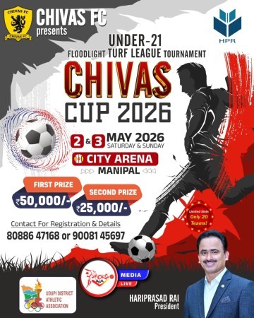 CHIVAS ಎಫ್‌ಸಿ ವತಿಯಿಂದ ಅಂಡರ್-21 ಫ್ಲಡ್‌ಲೈಟ್ ಟರ್ಫ್ ಲೀಗ್ ಟೂರ್ನಮೆಂಟ್ “CHIVAS ಕಪ್ 2026” ಇದೇ ಮೇ 2 ಮತ್ತು 3ರಂದು ಮಣಿಪಾಲದ City Arena ಮೈದಾನದಲ್ಲಿ ಅದ್ಧೂರಿಯಾಗಿ ನಡೆಯಲಿದೆ.
