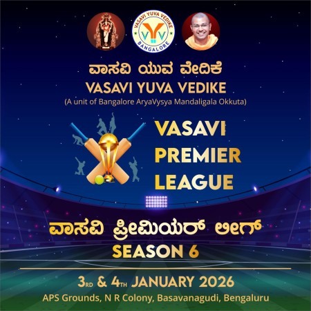 ಬೆಂಗಳೂರು: ವಾಸವಿ ಯುವ ವೇದಿಕೆ ( ಬೆಂಗಳೂರು ಆರ್ಯವೈಶ್ಯ ಮಂಡಳಿಗಳ ಒಕ್ಕೂಟದ ಘಟಕ) ವತಿಯಿಂದ ಪ್ರತಿಷ್ಠಿತ **ವಾಸವಿ ಪ್ರೀಮಿಯರ್ ಲೀಗ್ (VPL) – ಸೀಸನ್ 6** ಕ್ರಿಕೆಟ್ ಟೂರ್ನಮೆಂಟ್ ಅನ್ನು ಜನವರಿ 3 ಮತ್ತು 4, 2026 ರಂದು ಬೆಂಗಳೂರಿನ APS Grounds, ಎನ್.ಆರ್. ಕಾಲೋನಿ, ಬಸವನಗುಡಿ ಯಲ್ಲಿ ಭರ್ಜರಿಯಾಗಿ ಆಯೋಜಿಸಲಾಗಿದೆ.