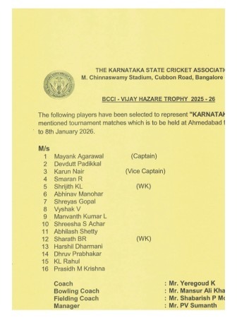 ಬೆಂಗಳೂರು: ದೇಶದ ಪ್ರಮುಖ ಏಕದಿನ ಕ್ರಿಕೆಟ್ ಟೂರ್ನಿಯಾಗಿರುವ ಬಿಸಿಸಿಐ ವಿಜಯ ಹಜಾರೆ ಟ್ರೋಫಿ 2025–26 ಗೆ ಕರ್ನಾಟಕ ರಾಜ್ಯ ತಂಡವನ್ನು ಪ್ರಕಟಿಸಲಾಗಿದ್ದು, ಪ್ರತಿಭಾವಂತ ಸ್ಪಿನ್ ಬೌಲರ್ ಶ್ರೀಶ ಆಚಾರ್ ಅವರು ಆಯ್ಕೆಯಾಗಿರುವುದು ಕರಾವಳಿ ಹಾಗೂ ರಾಜ್ಯದ ಕ್ರಿಕೆಟ್ ವಲಯದಲ್ಲಿ ಸಂತಸ ಮೂಡಿಸಿದೆ.