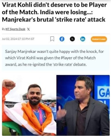 ಕೊನೆಯಲ್ಲಿ 59 ಎಸೆತಗಳಲ್ಲಿ 128.81ರ ಸ್ಟ್ರೈಕ್’ರೇಟ್’ನಲ್ಲಿ 76 ರನ್. ಇಡೀ ತಂಡ ಗಳಿಸಿದ 176 ರನ್’ಗಳಲ್ಲಿ 43% ಕೊಡುಗೆ ವಿರಾಟ್ ಕೊಹ್ಲಿಯದ್ದೇ. ಅದೂ ಎಂಥಾ ಸಂದರ್ಭದಲ್ಲಿ.. ಟಾಪ್ ಆರ್ಡರ್ ಕಂಪ್ಲೀಟ್ collapse ಆದಾಗ. ಹೀಗಾಗಿ ಕೊಹ್ಲಿಯ ಇನ್ನಿಂಗ್ಸ್ priceless. ಆ ದಿನ ಕೊಹ್ಲಿ ಆಟಿದ ಆಟವನ್ನು ನೋಡಿ ಆತನನ್ನೂ ದ್ವೇಷಿಸುವವರೂ ಶಹಬ್ಬಾಸ್ ಹೇಳಿದ್ದಾರೆ. ಆದರೆ ಮುಂಬೈನ ಮಾಜಿ ಕ್ರಿಕೆಟಿಗ, ಸೋಕಾಲ್ಡ್ ಕ್ರಿಕೆಟ್ ಪಂಡಿತ ಸಂಜಯ್ ಮಾಂಜ್ರೇಕರ್ ಮಾತ್ರ ಮೊಸರಲ್ಲಿ ಕಲ್ಲು ಹುಡುಕುತ್ತಿದ್ದಾನೆ.