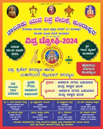 ಕುಂದಾಪುರ ತಾಲೂಕು ದ್ರಾವಿಡ ಬ್ರಾಹ್ಮಣ ಪರಿಷತ್(ರಿ) ಕುಂದಾಪುರ ಮತ್ತು ತಾಲೂಕು ಮಹಿಳಾ ವೇದಿಕೆ ಕುಂದಾಪುರ ಇವರ ಜಂಟಿ ಆಶ್ರಯದಲ್ಲಿ,ವಿಪ್ರರಿಗಾಗಿ ಮಾರ್ಚ್ 9,10 ರಂದು ಹೊನಲು ಬೆಳಕಿನ ಕ್ರಿಕೆಟ್ ಹಬ್ಬ ವಿಪ್ರ ಟ್ರೋಫಿ-2024 ಕ್ರಿಕೆಟ್ ಪಂದ್ಯಾಟ ಆಯೋಜಿಸಲಾಗಿದೆ.